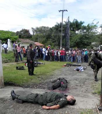| Narco terroristas del frente 48 de las Fuerzas Armadas Revolucionarias de Colombia - FARC activaron una carga explosiva que habían dejado a la orilla del rio Putumayo en el momento que una patrulla de la Infantería de Marina se desplazaba por el sector se Piñuña Negra, zona selvática del municipio de Puerto Leguízamo, departamento de Putumayo, resultando muertos los infantes de marina profesionales Lucas Orlando Silva y Álvaro Rivillas, quienes prestaban sus servicios a la Armada Nacional desde hace 9 años y 5 meses, respectivamente y heridos otros cuatro, de los cuales dos fueron trasladados al Hospital Militar de la ciudad de Bogotá, por la gravedad de sus heridas. |