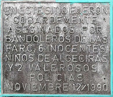 | El 12 de noviembre de 1990, al medio día, el Cabo Primero Oscar Escobar Páez y el Agente Wilson Brilande Tigreros de la Policía Nacional y nueve niños «patrulleritos» de la Policía Cívica Juvenil, acompañaban una carrera ciclística entre los municipios Algeciras y Campoalegre en el departamento del Huila.